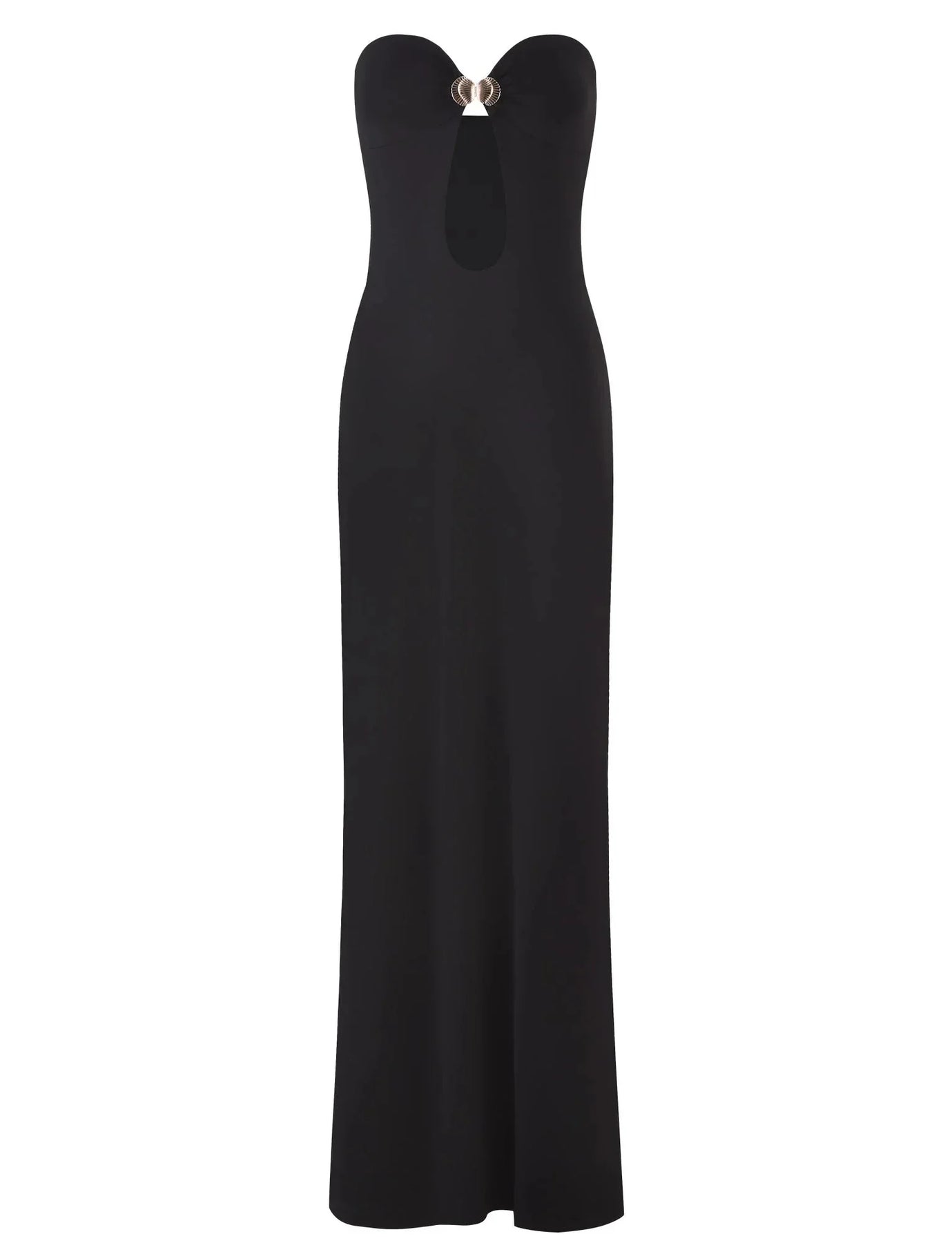 Straal tijdloze klasse uit in de Solara-jurk, een verfijnde lange jurk met een luxe gouden accent. De strakke pasvorm en elegante sweetheart-halslijn zorgen voor een vrouwelijke, krachtige uitstraling. Perfect voor een gala, chic diner of speciale avond—met deze jurk maak je gegarandeerd indruk.