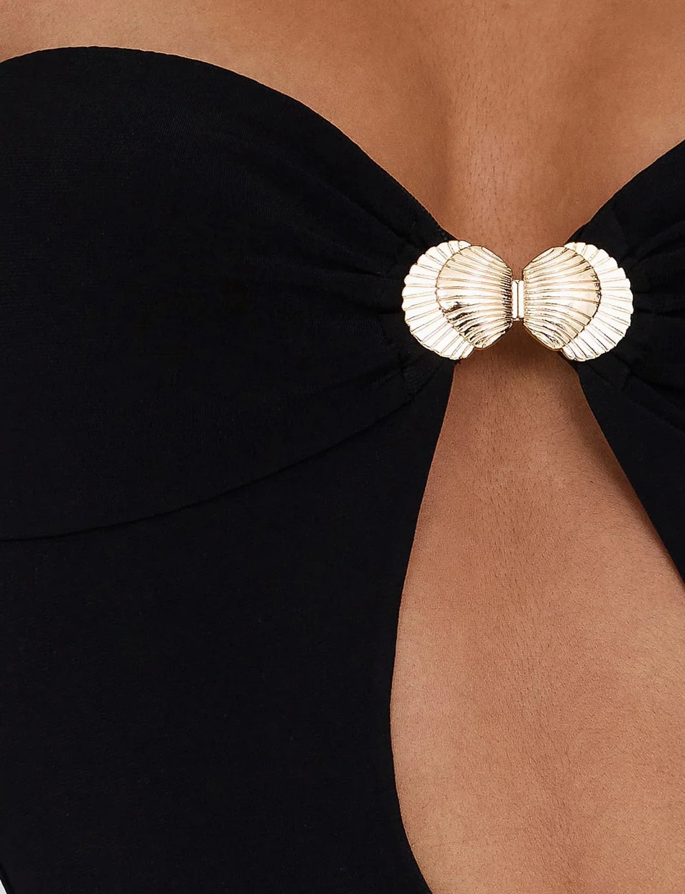 Uniek gouden detail – Een verfijnde metalen afwerking bij de halslijn voegt een luxe touch toe.